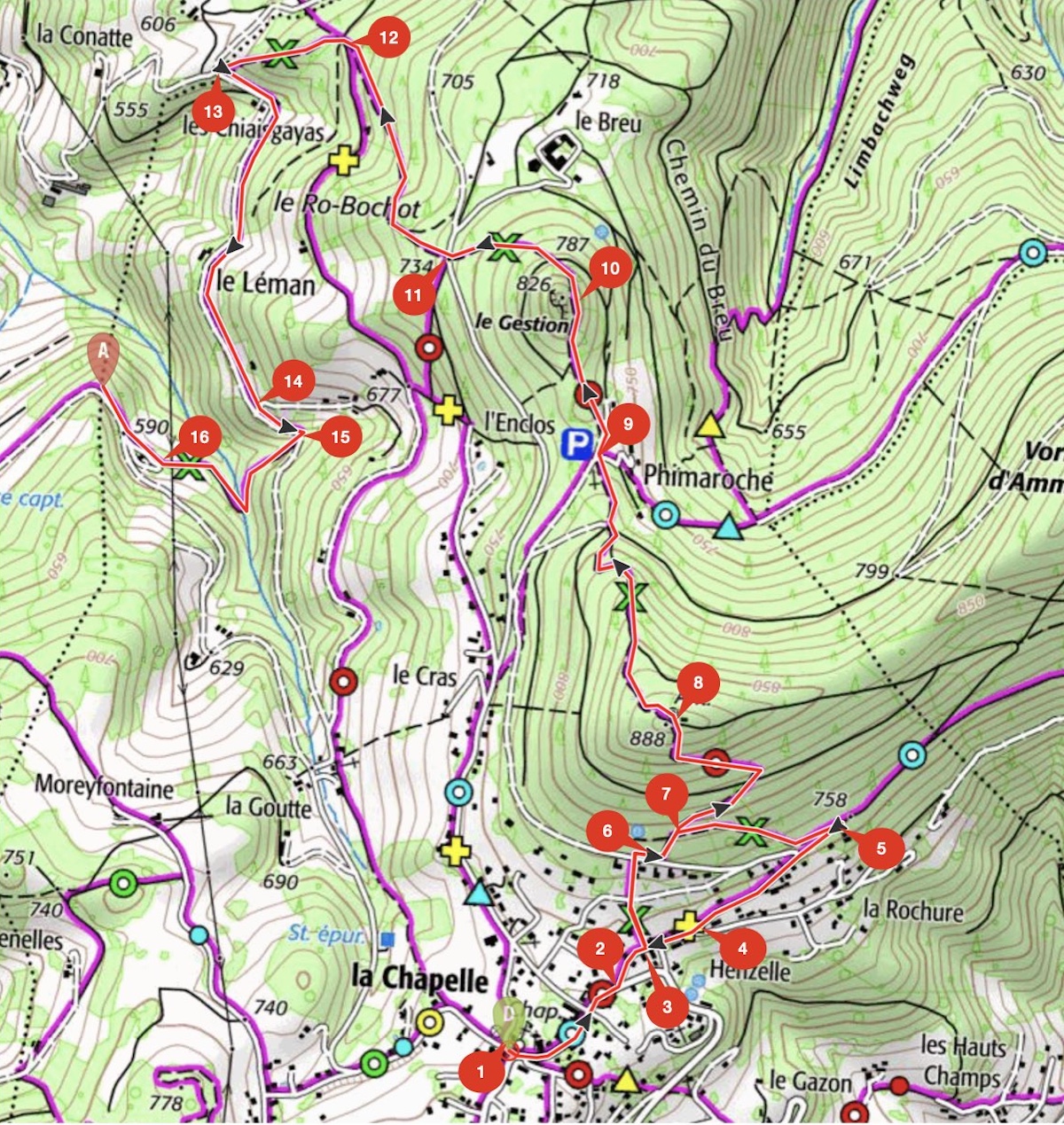 SENTIER : 12.1 LONGUEUR : 5251 m ZONE : 2 PLAN : P4 symbologie : chevalet vert DEBUT : Labaroche Chapelle (en Y)FIN : Limite commune Orbey RESPONSABILITE : Rudloff-Siegel-Hugg NOM SENTIER : Cra-Gestion