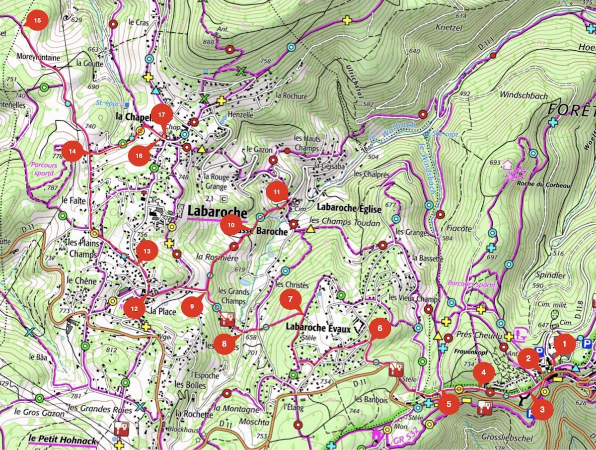 symbologie : disque bleu DEBUT : Trois Epis centreFIN : Limite commune Orbey