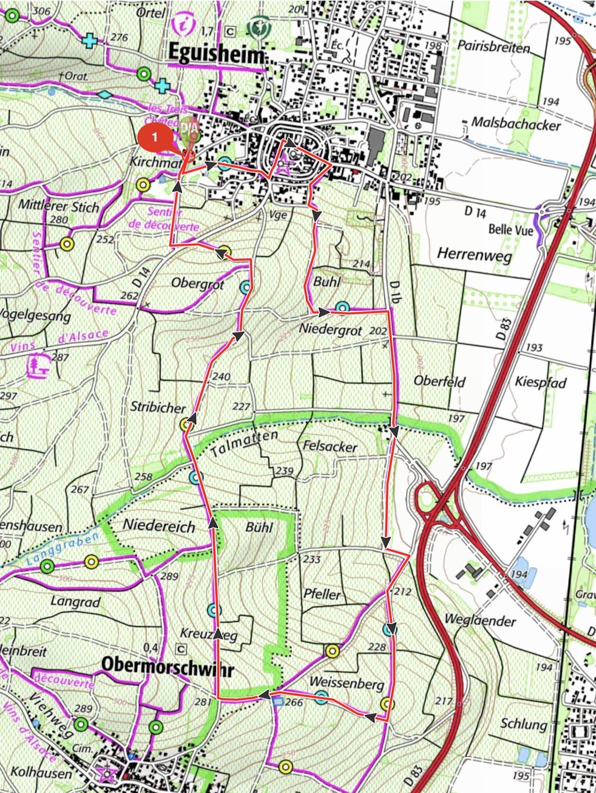 symbologie : anneau bleu DEBUT : Eguisheim campingFIN : Eguisheim camping