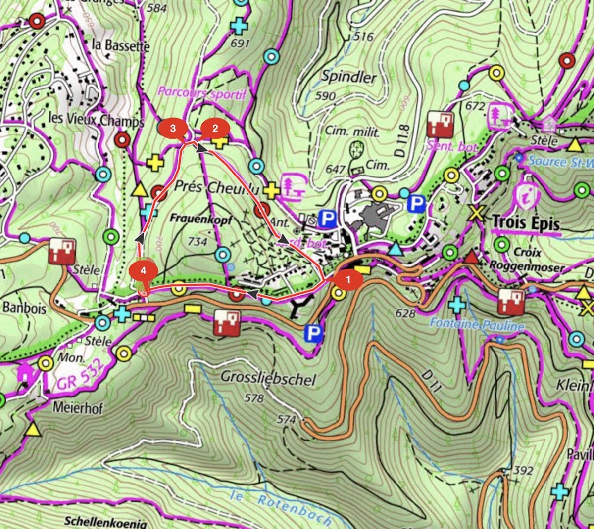 SENTIER : 104 LONGUEUR : 1198 m ZONE : 0 PLAN : P3 symbologie : anneau rouge DEBUT : FIN : RESPONSABILITE : Le Gal NOM SENTIER : Tour du Frauenkopf