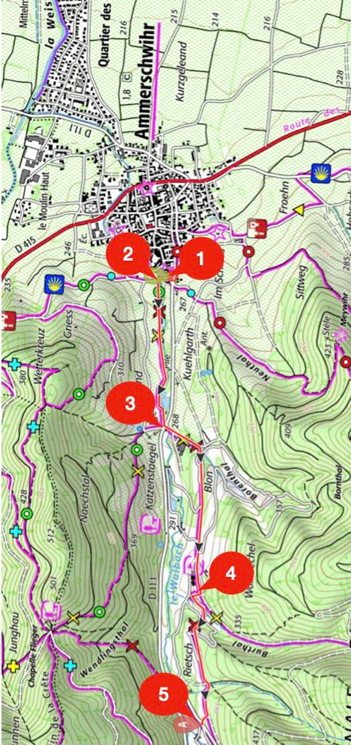symbologie : chevalet rouge DEBUT : Ammerschwihr porte hauteFIN : Golf ouest route des trois épis D11.VIII et D11.1