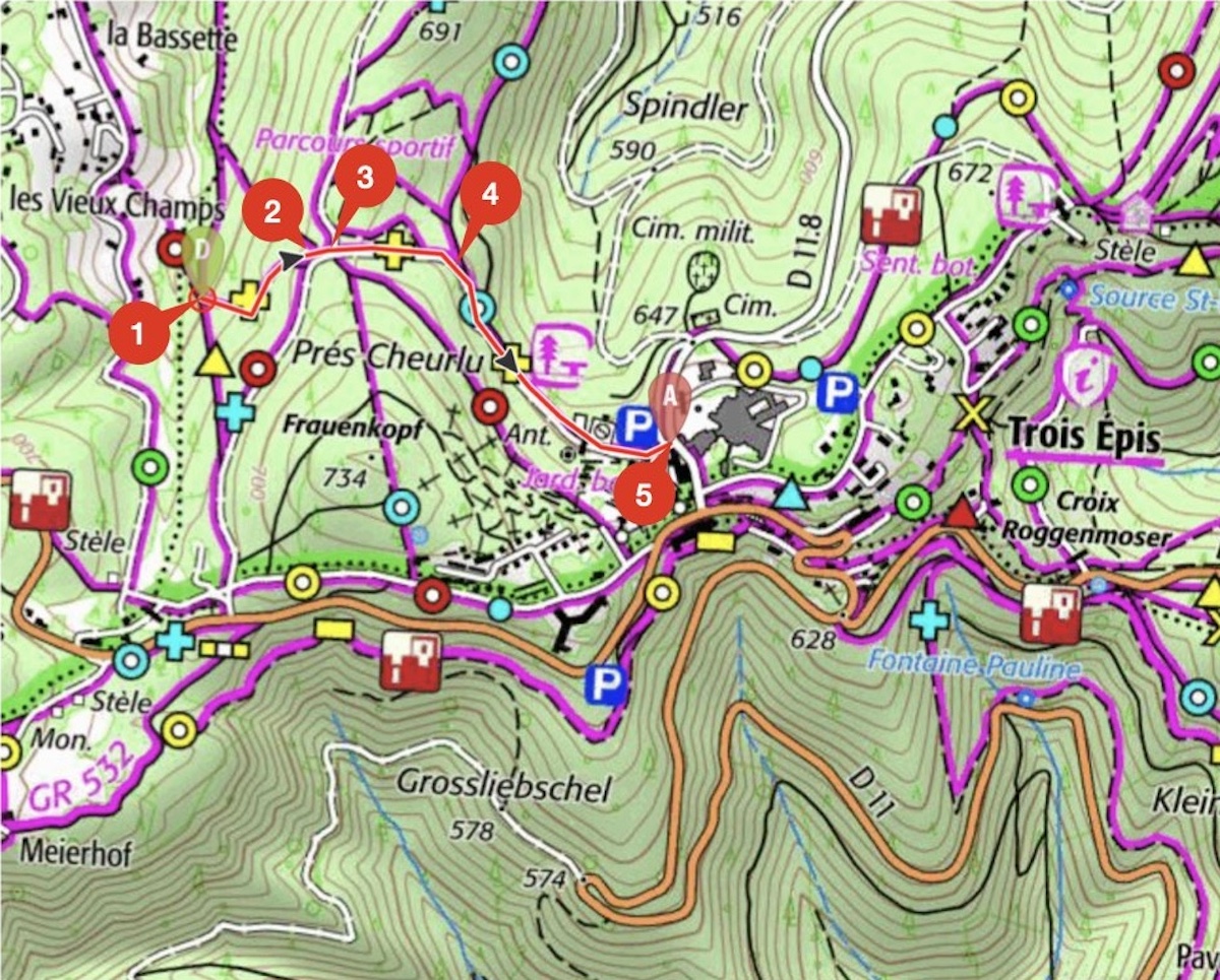 SENTIER : 7.3 LONGUEUR : 1013 m ZONE : 2 PLAN : P3 symbologie : croix jaune DEBUT : Intersection Triangle jauneFIN : Trois Epis centre Branche Est RESPONSABILITE : Le Gal - Weber NOM SENTIER : Liaison Trois Epis - Labaroche Eglise