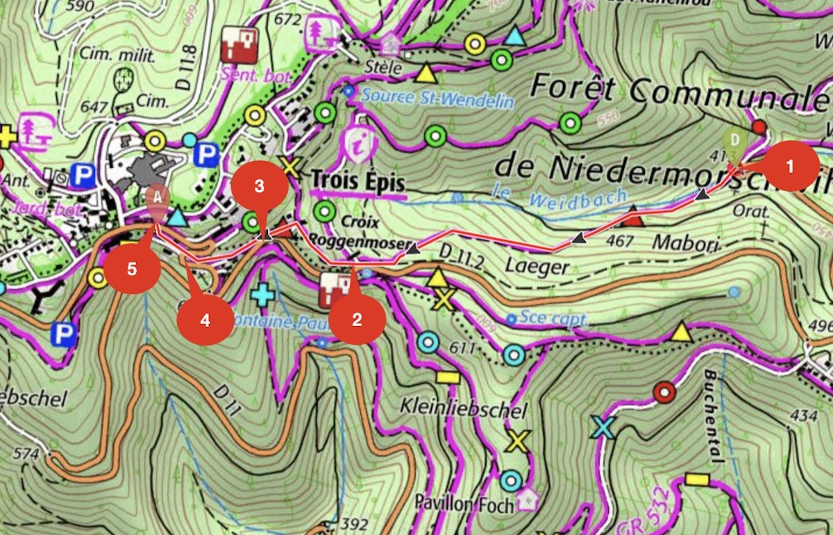 SENTIER : 6.1 LONGUEUR : 1672 m ZONE : 2 PLAN : P3 symbologie : Triangle Rouge DEBUT : Intersection route D11 (Epingle)FIN : Trois Epis MGEN RESPONSABILITE : Le Gal - Weber NOM SENTIER : Katzenthal - Trois Epis