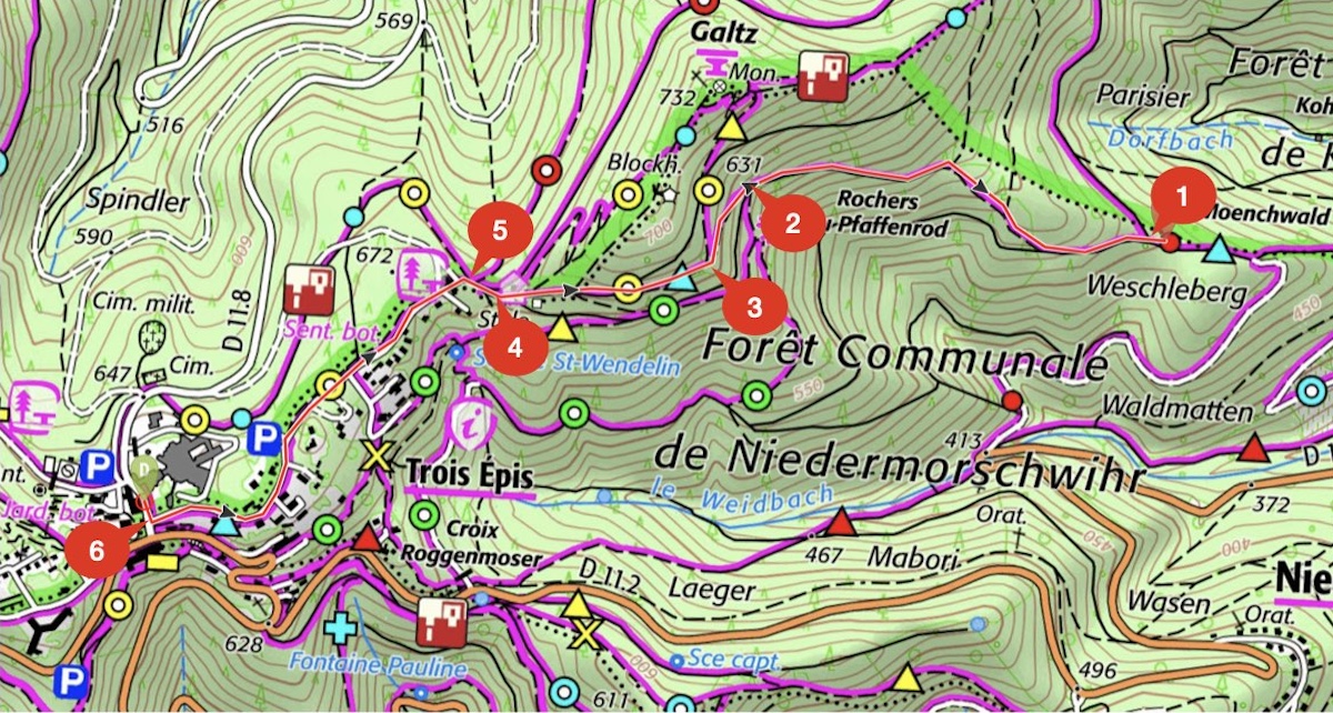 SENTIER : 6.3 LONGUEUR : 2389 m ZONE : 2 PLAN : P3 symbologie : triangle bleu DEBUT : Limite commune de KatzenthalFIN : Trois Epis MGEN RESPONSABILITE : Le Gal - Weber NOM SENTIER : Trois Epis - Katzenthal