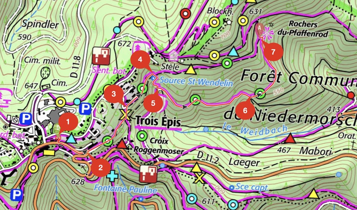 SENTIER : 6.5 LONGUEUR : 1882 m ZONE : 2 PLAN : P3 symbologie : anneau vert DEBUT : Trois Epis Centre MGENFIN : Pfaffenrod RESPONSABILITE : Le Gal - Weber NOM SENTIER : Anneau vert Sentier de la forêt