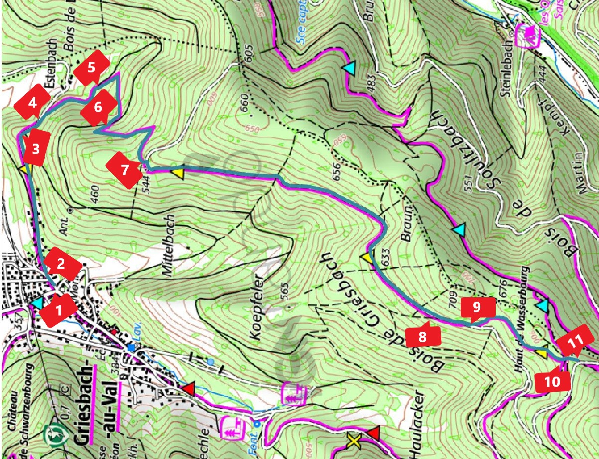 SENTIER : 17.3 LONGUEUR : 4134 m ZONE : 4 PLAN : P7 symbologie : triangle jaune DEBUT : Grisbach monument au mortsFIN : Haut de Wasserbourg RESPONSABILITE : Bentz NOM SENTIER : Griesbach - Haut de Wasserbourg