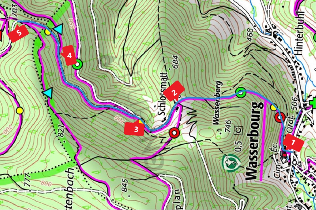 SENTIER : 18.1 LONGUEUR : 2403 m ZONE : 5 PLAN : P8 symbologie : disque jaune DEBUT : Mairie de WasserbourgFIN : Haut de Wasserbourg RESPONSABILITE : Meyer NOM SENTIER : Wasserbourg - Haut de Wasserbourg