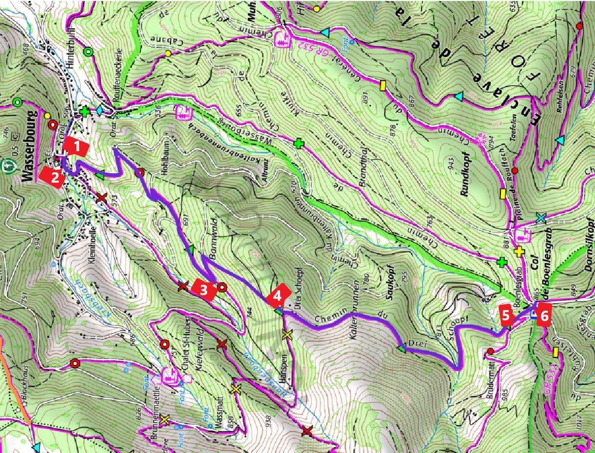 SENTIER : 20 LONGUEUR : 4872 m ZONE : 5 PLAN : P symbologie : triangle vert DEBUT : Mairie WasserbourgFIN : Col du Boenlesgrab RESPONSABILITE : Meyer NOM SENTIER : Wasserbourg - Col du Boenlesgrab