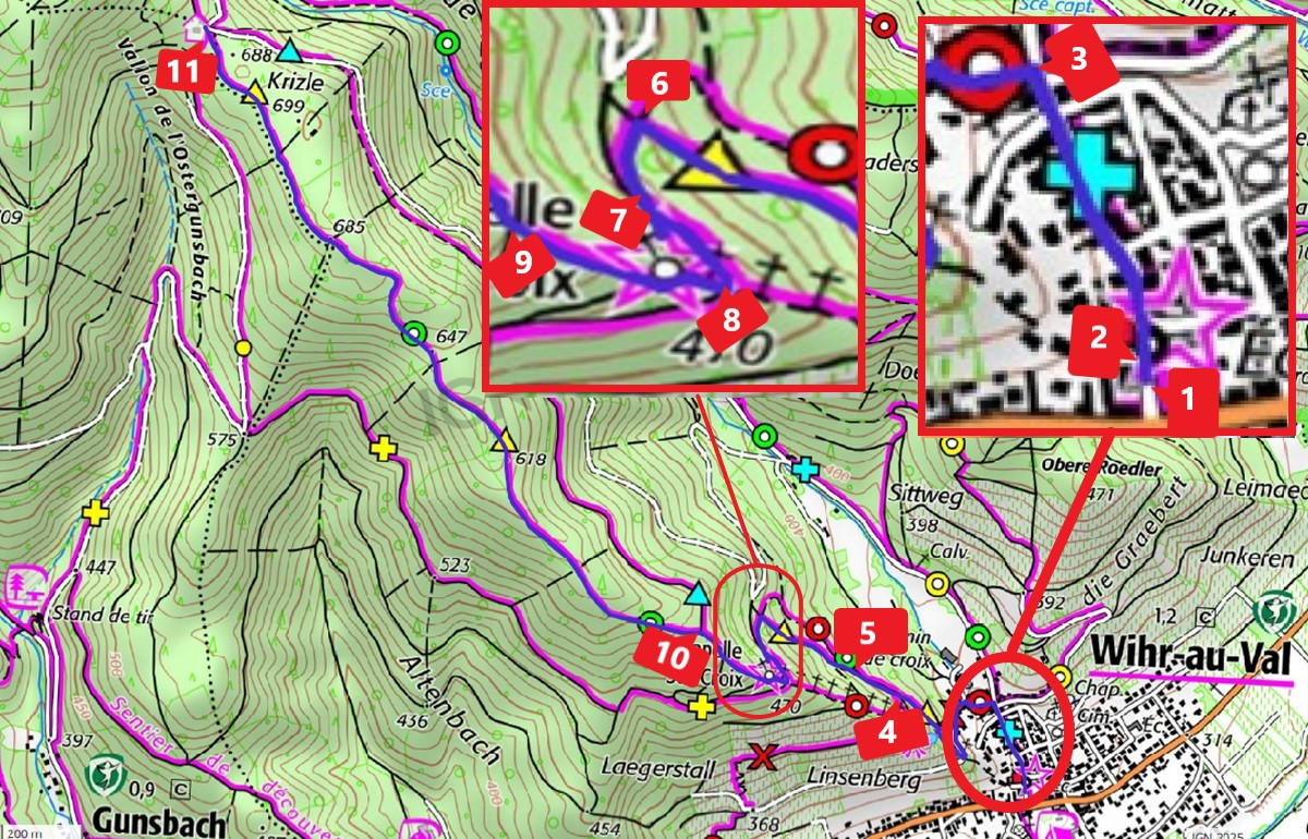 SENTIER : 15.1 LONGUEUR : 3686 m ZONE : 3 PLAN : P6 symbologie : triangle jaune DEBUT : Mairie FIN : Abri forestier RESPONSABILITE : Siegel Ehret NOM SENTIER : Wihr au Val - Abri Krizle par carrossable